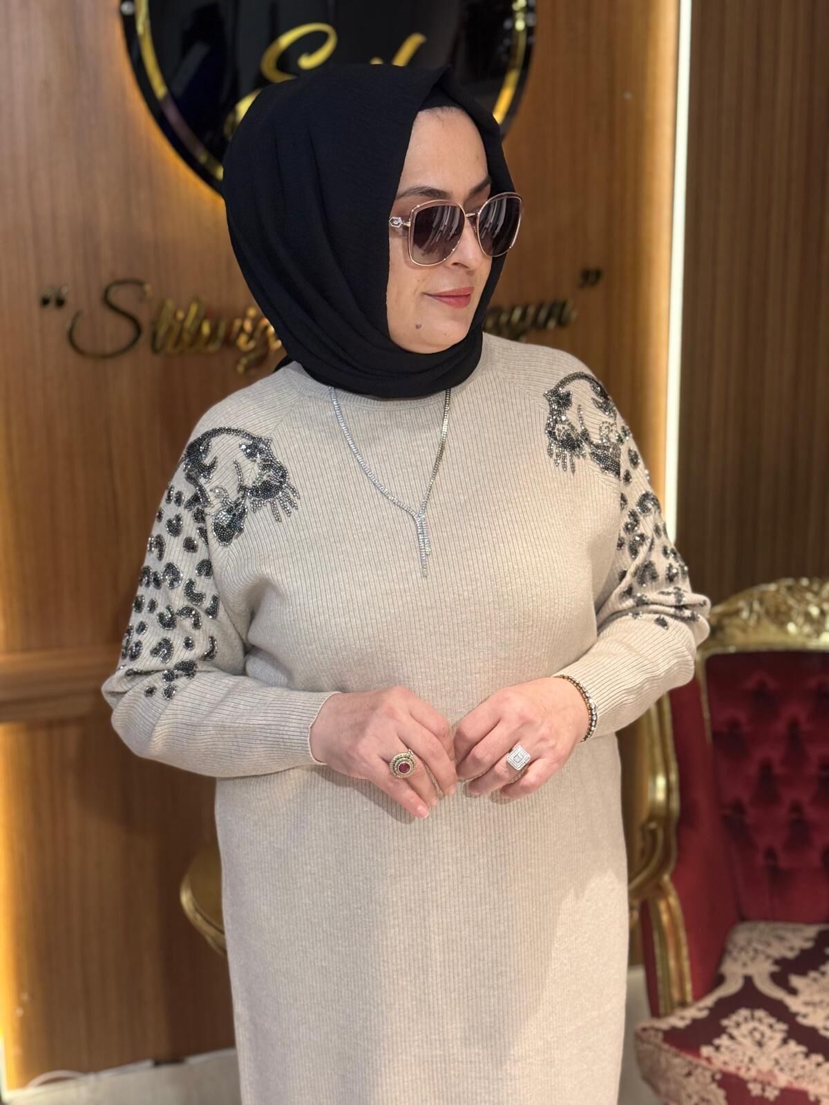 Fuat Gürşen 4106 Kolları İşleme Detay Kemerli Merserize Elbise - Bej