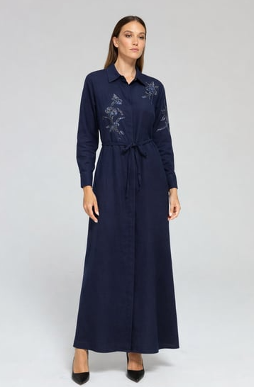 Fuat Gürşen 5108 Çiçeği Boncuk İşlemeli Elbise - Lacivert