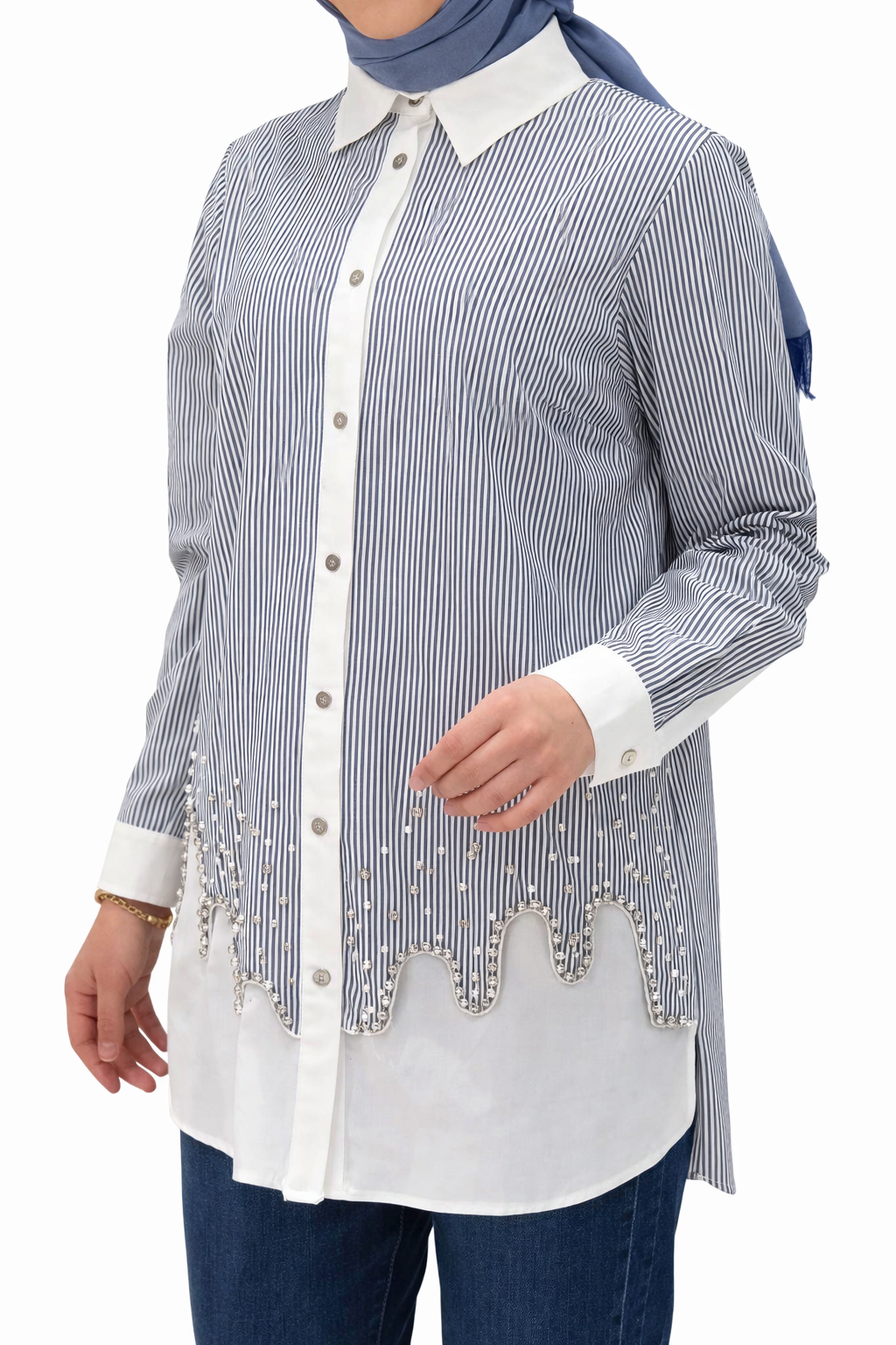 Fuat Gürşen 5304 Oval Kesim Taş İşlemeli Tunik - Lacivert