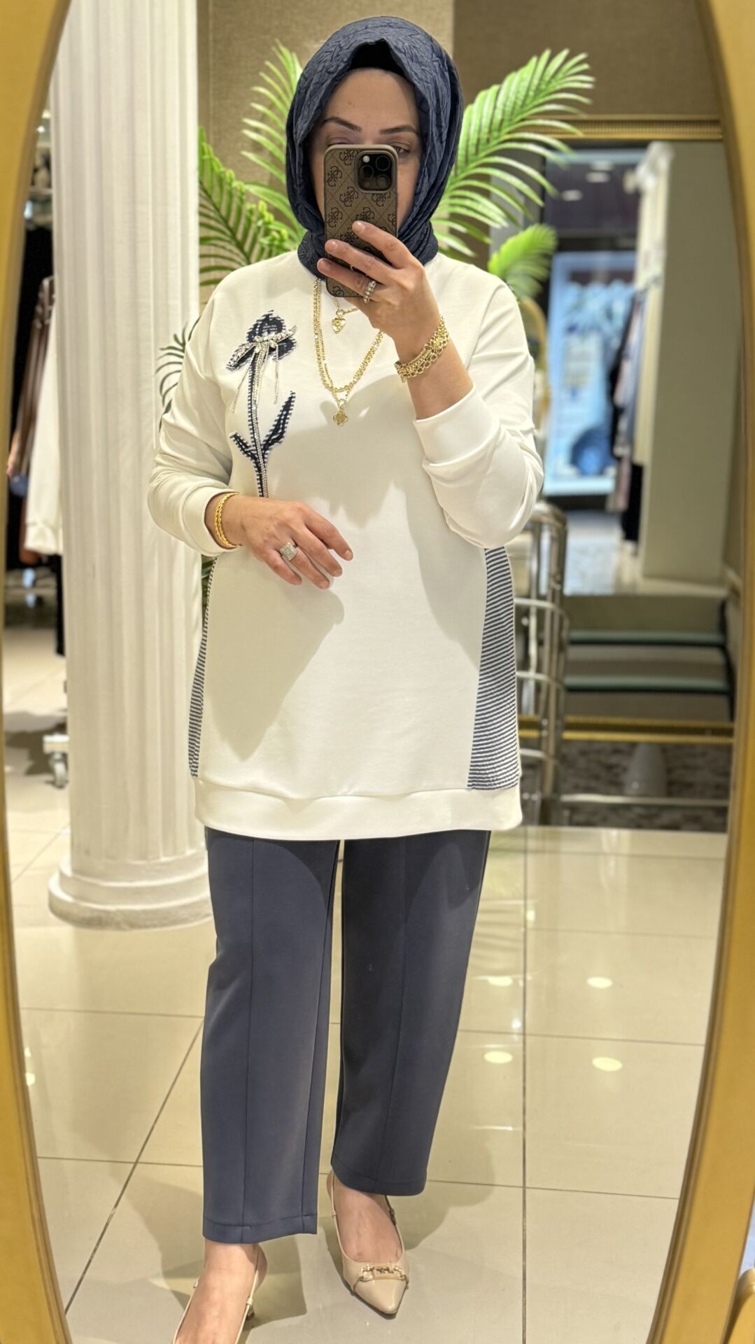 Fuat Gürşen 5366 -Taş İşlemeli Çizgi Garnili Tunik - Ekru