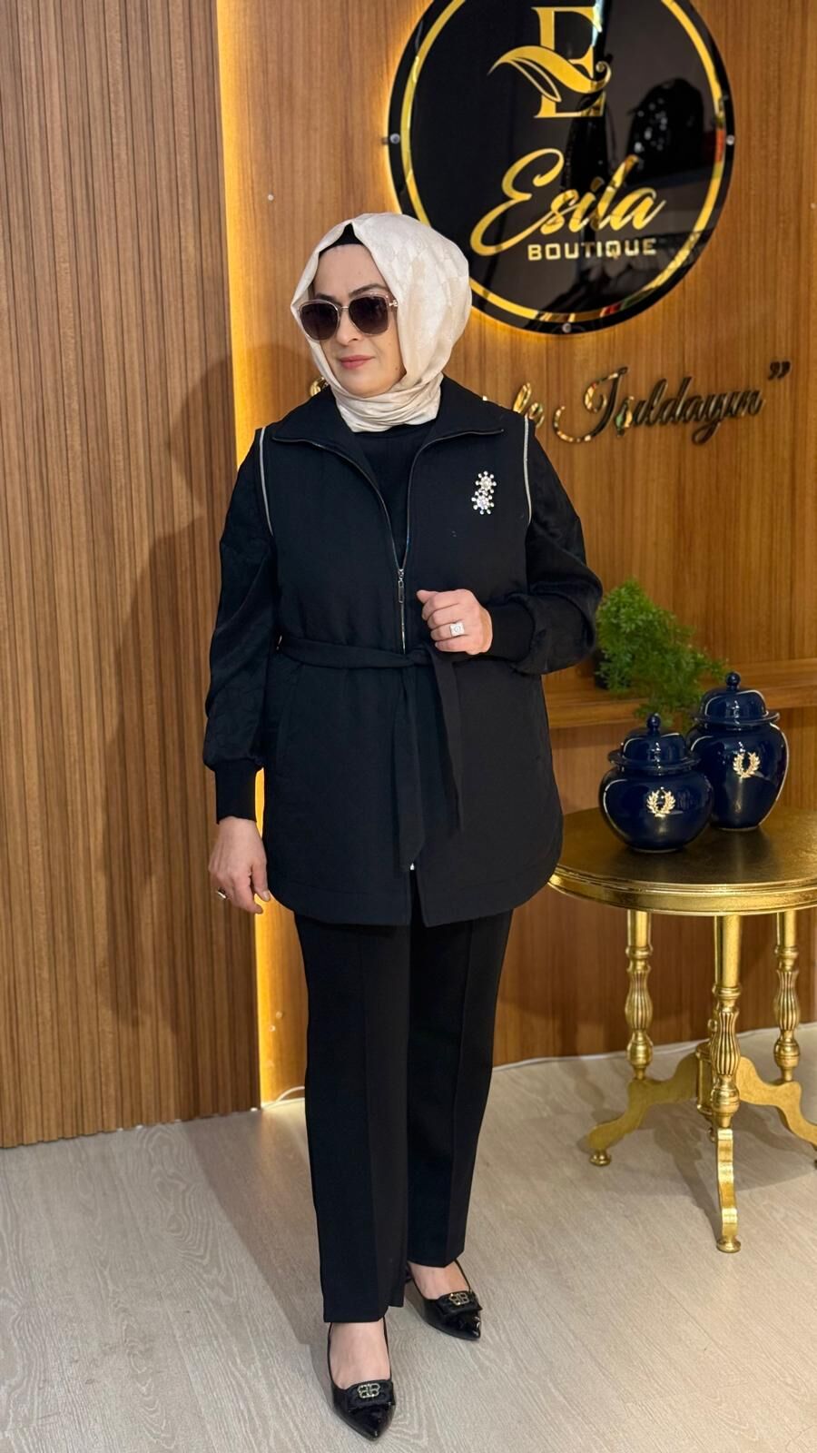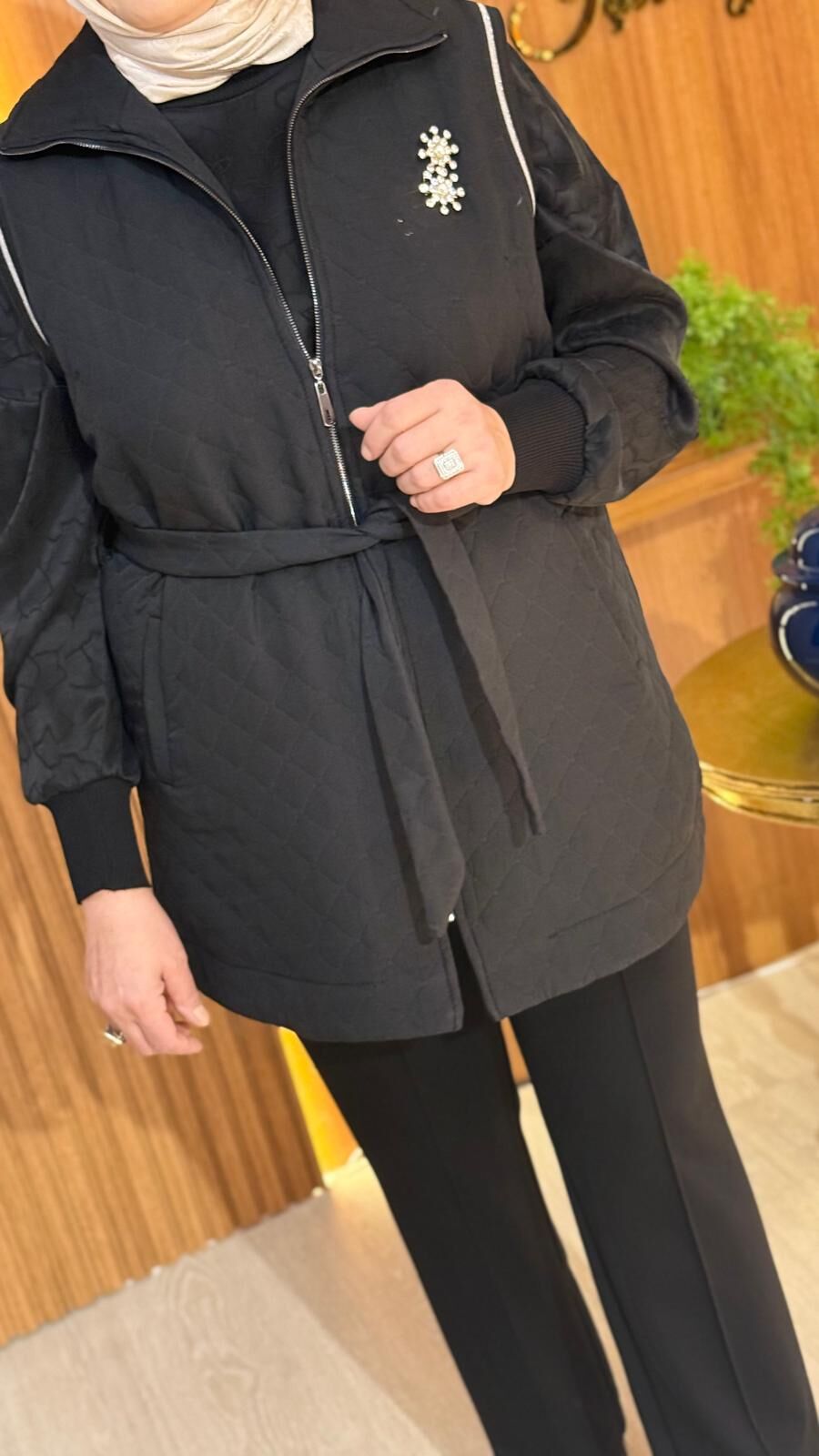 FUAT GÜRŞEN / 4503 YAKASI BROŞLU KABARTMA DESENLİ YELEK- SİYAH