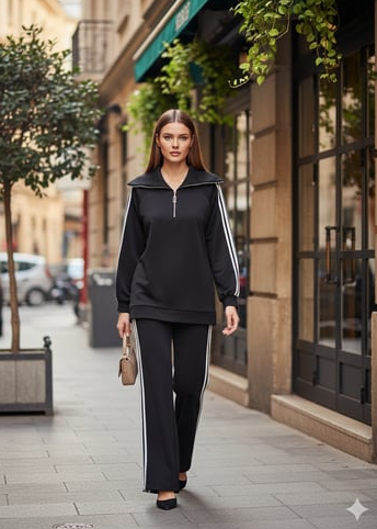 Nuss 1093 Gemici Yaka Şerit Detay Pantolonlu Takım - Siyah