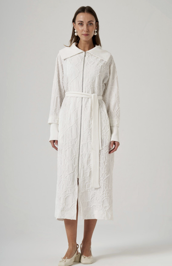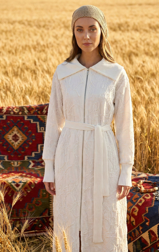 Nuss-6047- Önü Fermuarlı Triko Kol Detay Kuşaklı Kap Ceket -Ekru