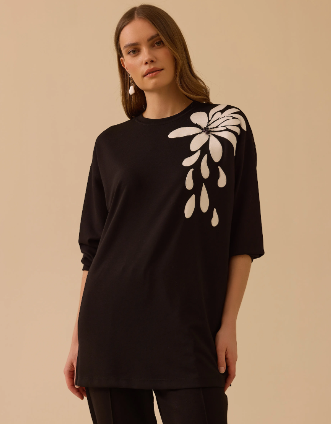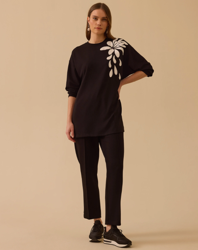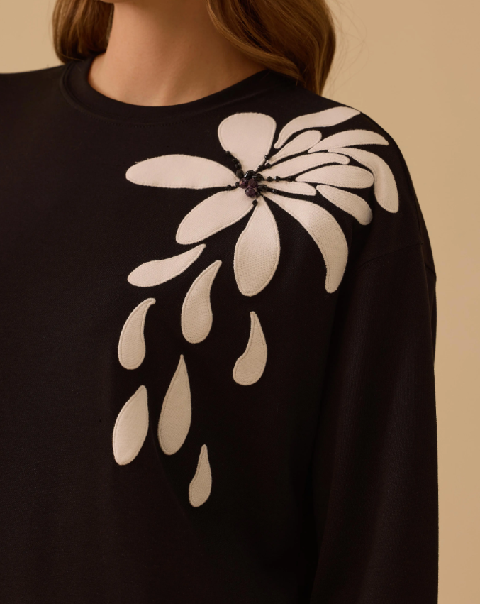 Nakışlı Boncuk Detaylı Sweatshirt, zarif nakış ve boncuk süslemeleriyle günlük stile şık ve dikkat çekici bir dokunuş katar.