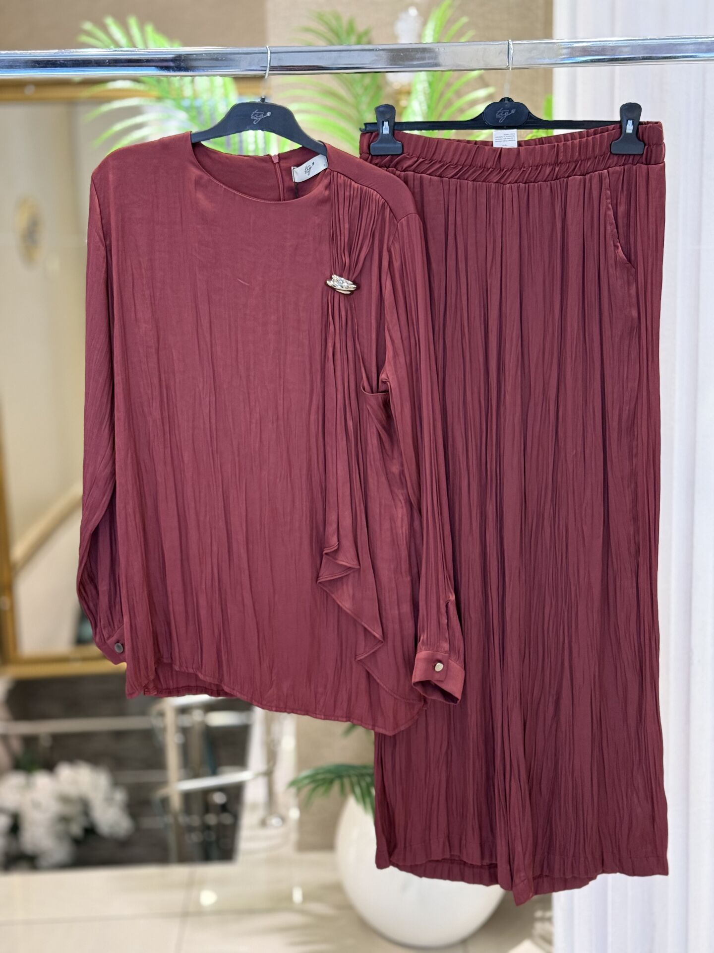 Tığtriko Metal Tokalı Fular Detaylı Saten Pantolonlu Takım-Bordo
